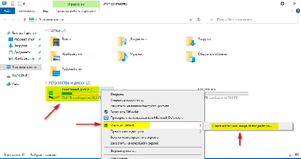 Перед загрузкой образа нужно убедиться в том, что на винчестере или другом месте для хранения есть свободное место. В качестве последних могут выступать флешка или сетевое «облако». Для бекапа системы нужно запустить мастер создания резервной копии выбором в главном окне Image this disk.., либо в проводнике нажать на резервируемый диск и в контекстном меню выбрать Macrium Reflect > Create a Macrium Image of this partition.