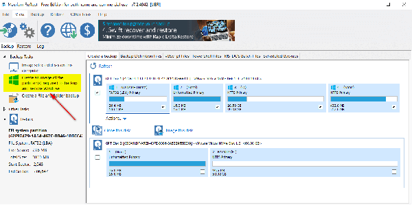 На табе Backup основного окна программы в разделе Backup Tasks выбрать пункт Create an image of the partition(s) required to backup and restore Windows.